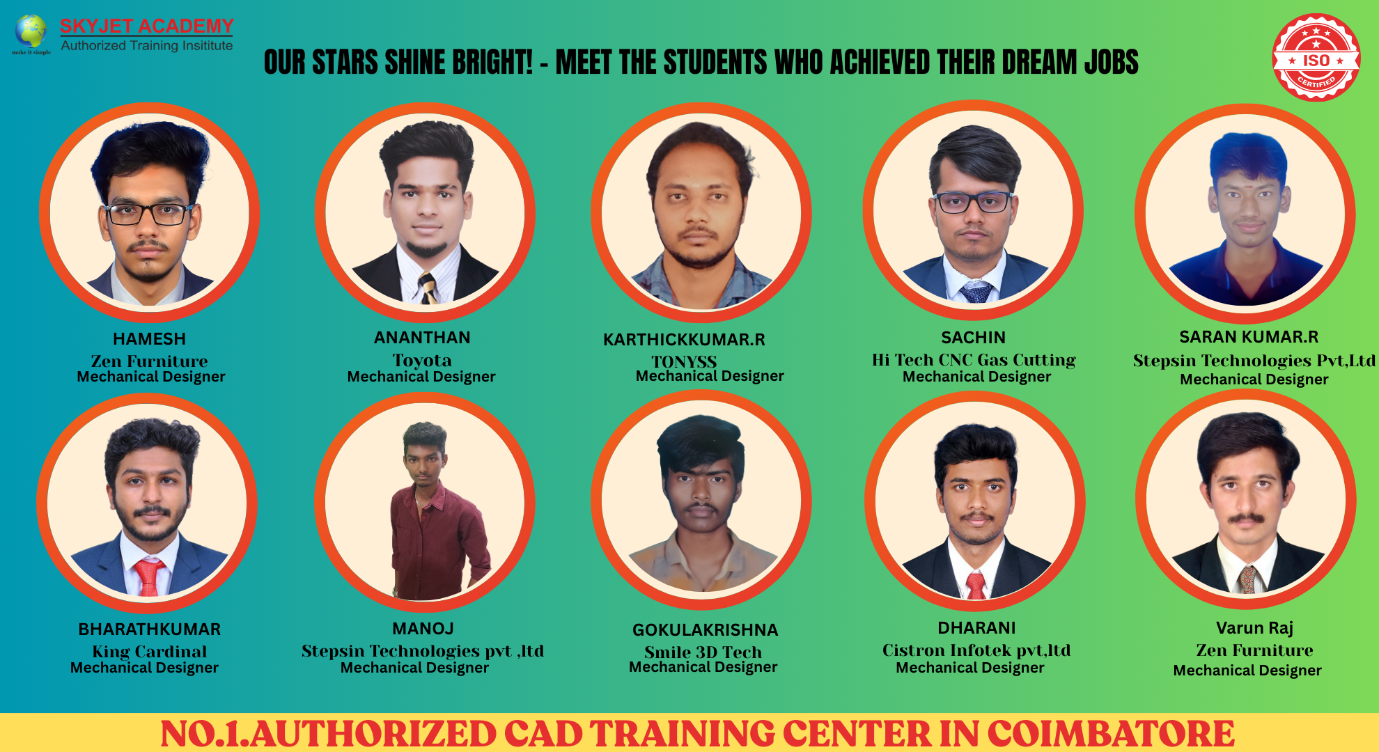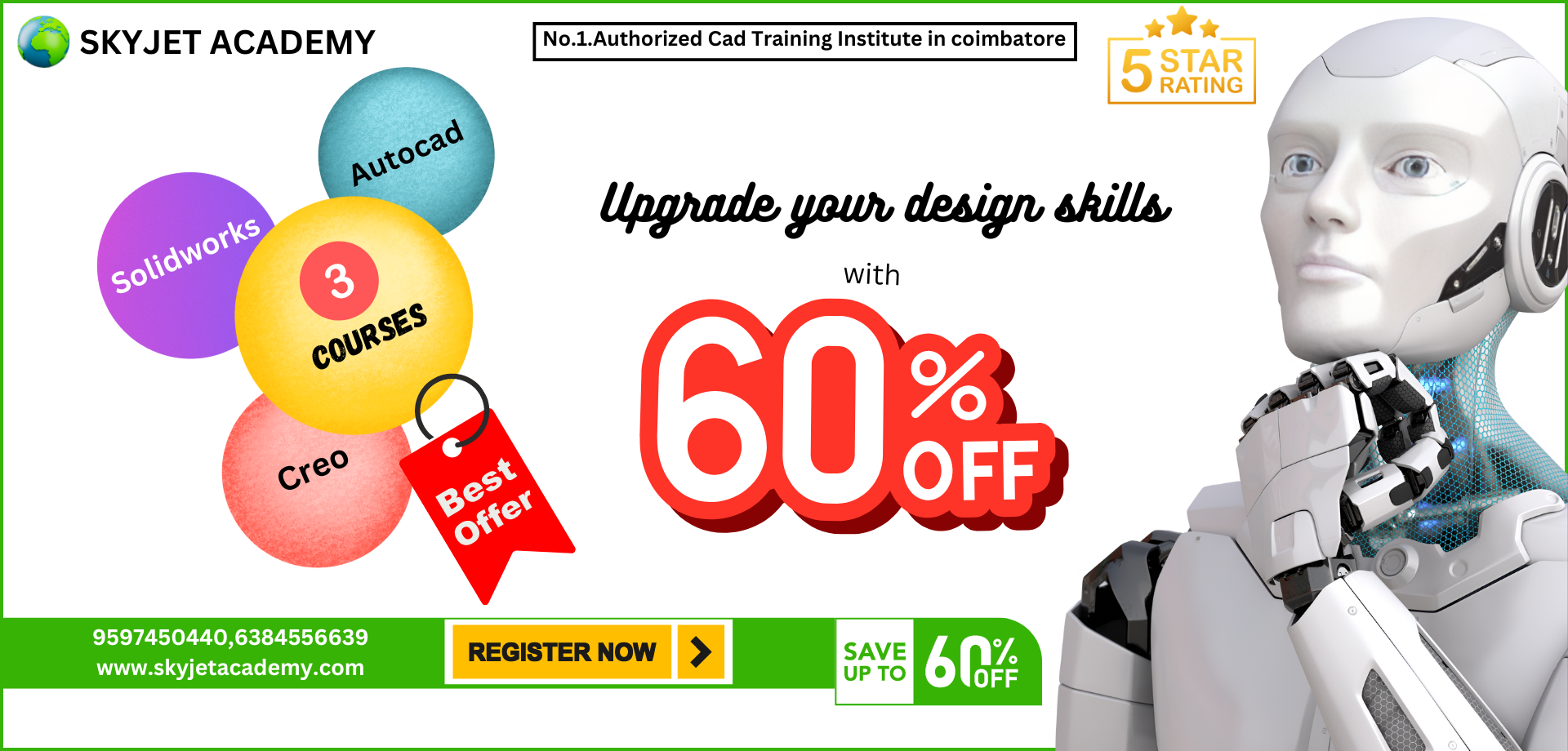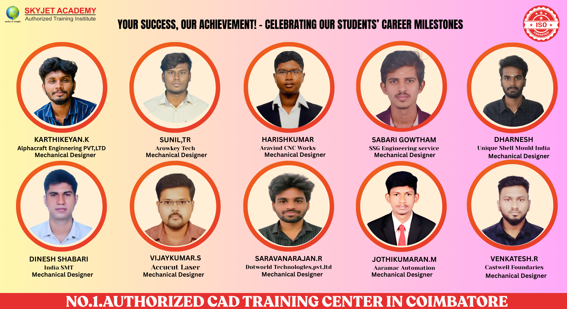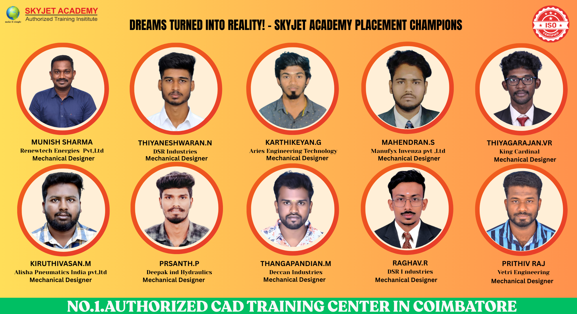 Skyjet Academy is a leading authorized CAD training institute in Coimbatore, specializing in SolidWorks, AutoCAD, CATIA, CREO, and Ansys. Since 2013, we have trained and guided thousands of students to become professional designers with placements in top companies.